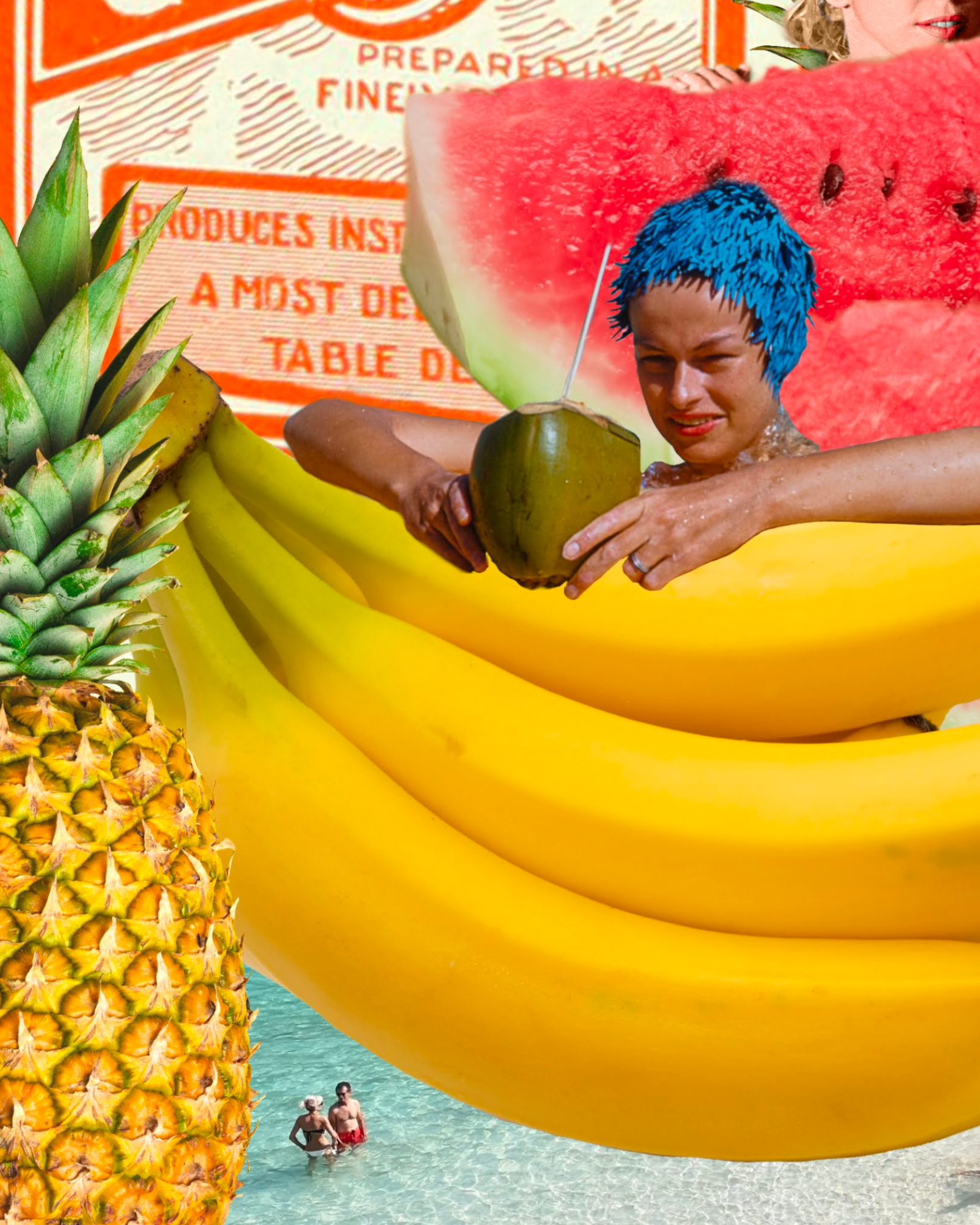 Each piece is digitally created by me, layering carefully chosen vintage imagery with bold fruity details and a slightly unexpected twist. In this print, you’ll spot plenty of fruit, an amazing swimming hat, the red apple motel, jelly, a beach scene and a cheeky parrot all hanging out together on holiday.